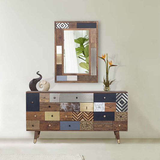Meuble d'entrée multi-matériaux peau de vache bois sculpté | Manguier Terranova