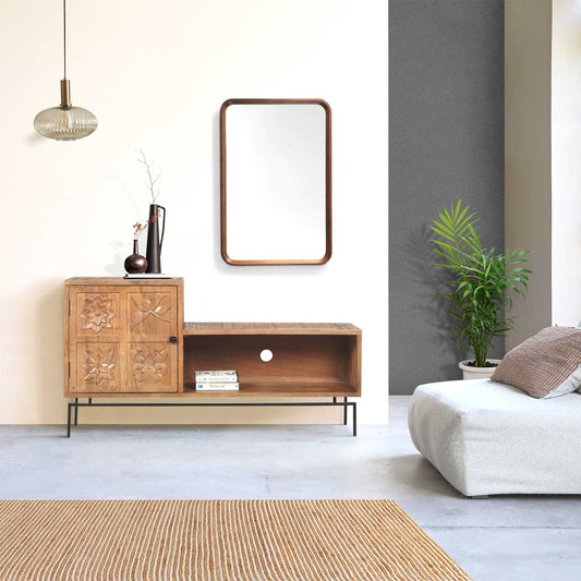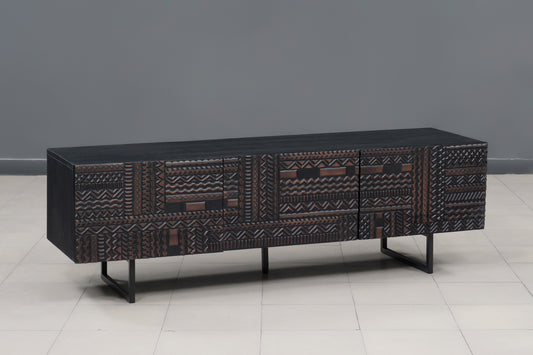 Meuble Tv bois sculpté motif géométrique 4P | Manguier Maglan