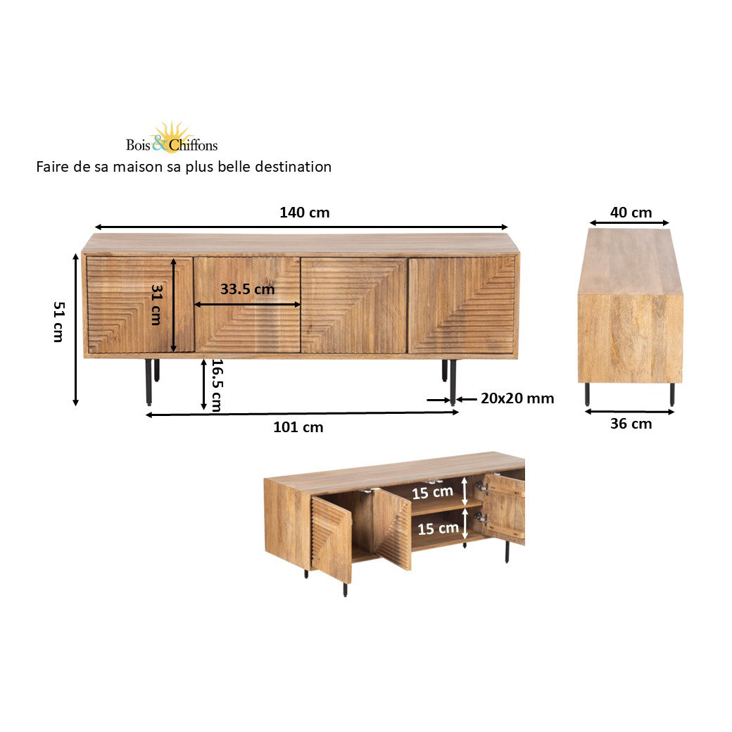 Meuble Tv bois sculpté motif géométrique 4P | Manguier Maglan II