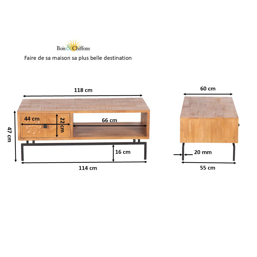 Table basse sculptée 1 tiroir, 1 niche | Manguier Sculture II
