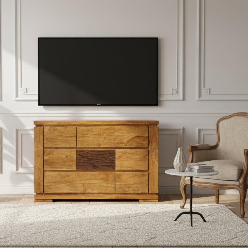 Cómoda de madeira entalhada em dois tons | Acácia Maia